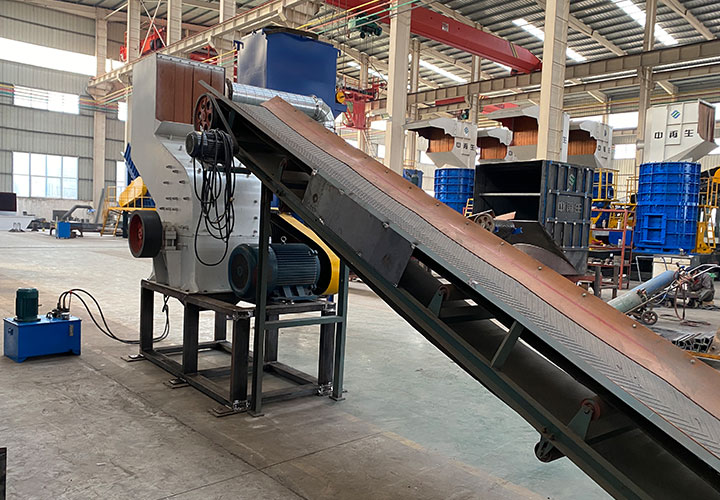 破碎線主機(jī)殼體采用特厚鋼板制造,內(nèi)襯為高錳鑄鋼件,可更換;主機(jī)轉(zhuǎn)子盤安裝于水平軸上,轉(zhuǎn)子盤圓周分布有銷軸,軸向懸有錘頭;主軸用滾珠軸承支撐,循環(huán)油強(qiáng)制潤(rùn)滑冷卻,并裝有溫度傳感器;進(jìn)料口裝有液壓輥筒喂料裝置,位置一高一低,同向旋轉(zhuǎn),能將大件松散物料壓扁,送入破碎腔內(nèi)。