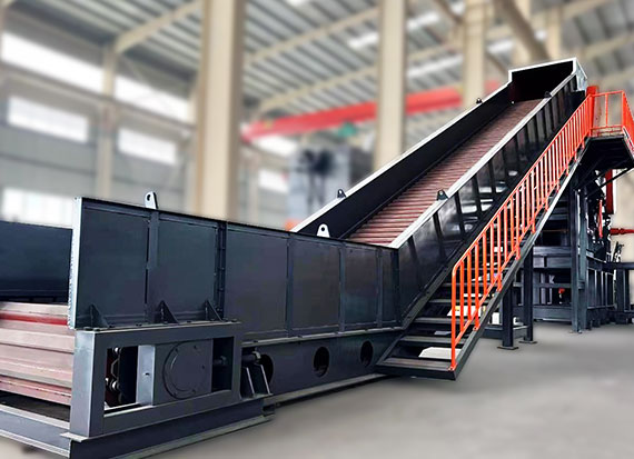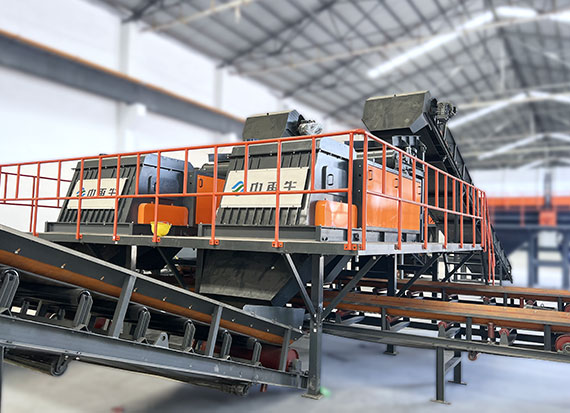 破碎線主機殼體采用特厚鋼板制造,內(nèi)襯為高錳鑄鋼件,可更換;主機轉(zhuǎn)子盤安裝于水平軸上,轉(zhuǎn)子盤圓周分布有銷軸,軸向懸有錘頭;主軸用滾珠軸承支撐,循環(huán)油強制潤滑冷卻,并裝有溫度傳感器;進料口裝有液壓輥筒喂料裝置,位置一高一低,同向旋轉(zhuǎn),能將大件松散物料壓扁,送入破碎腔內(nèi)。